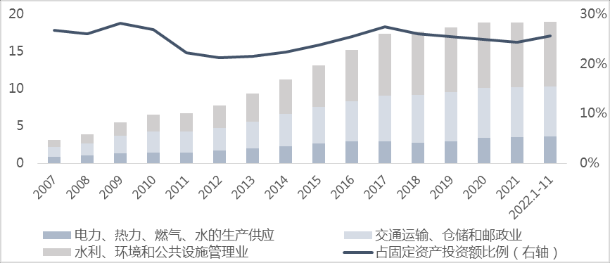 根據WIND數據,廣義基建投資2021年達到18.9萬億元,占全社會固定資產投資額的24%,具體分為三大類行業(yè),一是交通運輸、倉儲和郵政業(yè),占2021年基建投資的36%,主要有道路運輸業(yè)(包括城市軌交,不含市政道路)、鐵路運輸業(yè)、倉儲業(yè)等;二是水利、環(huán)境和公共設施管理業(yè),占2021年基建投資的46%,主要有公共設施管理業(yè)(包括城市道路、排水、橋梁、廣場、公園等市政工程和城市公共設施)、水利管理業(yè)、生態(tài)保護和環(huán)境治理業(yè)等;三是電力、熱力、燃氣及水的生產和供應業(yè),占2021年基建投資的18%。