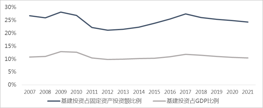 圖2:我國基建投資占固定資產投資、GDP比例測算