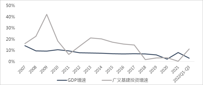 其次,基建投資是我國實施宏觀調控的重要抓手。基建投資可控性強,可在預期時間內促進經濟企穩(wěn)、穩(wěn)定民生就業(yè)、改善市場預期,是良好的逆周期政策調節(jié)工具。千禧年以來的經濟下行期中,基建投資均起到了熨平周期、穩(wěn)定增長的作用。第一次是2008-2009年,面對全球金融危機,我國推出“四萬億”等財政政策,基建投資同比增速大幅提高至23%、42%,占2009年GDP比例達12.8%,強勢托底經濟;第二次是2012-2013年,面對歐債危機等外生沖擊,基建投資增速在2013年大幅回升至21%,疊加制造業(yè)、房地產一同刺激經濟復蘇;第三次是2016年,面對經濟下行,基建投資在相對寬松的政策環(huán)境下維持高位,以15.71%的增速穩(wěn)住經濟大盤;第四次是2022年前三季度,我國經濟增速受疫情沖擊下滑至3%,基建投資再度扛起穩(wěn)增長大旗,同比增速達到11.2%,有力帶動經濟回歸正常軌道、確保運行在合理區(qū)間。